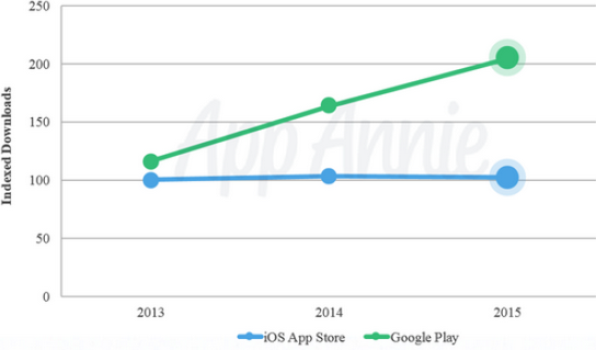 而安卓系統(tǒng)另一個(gè)money來(lái)源,就是從移動(dòng)應(yīng)用商店Google Play中獲得的營(yíng)收。據(jù)應(yīng)用研究公司App Annie發(fā)布的研究報(bào)告顯示,2015年,Google Play的下載量比蘋(píng)果App Store高出100%,2014年則是高出60%。也就是說(shuō),去年Google Play不僅僅體量更大,增速也要快于App Store。
