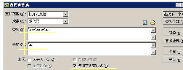 打開dreamweaver--->用ctrl+f快捷鍵打開搜索功能,在查找里面輸入:\r\n\s*\r\n。在替換里面輸入:\n。然后在選項(xiàng)里勾選:使用正則表達(dá)式。然后點(diǎn)擊“替換全部”。